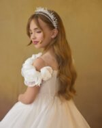 Transform any special occasion into a storybook moment with this breathtaking ivory floor-length gown. Featuring a dramatic silhouette and artisanal floral details, this dress is crafted for those who want to make a truly unforgettable statement at weddings, galas, or formal portraits.