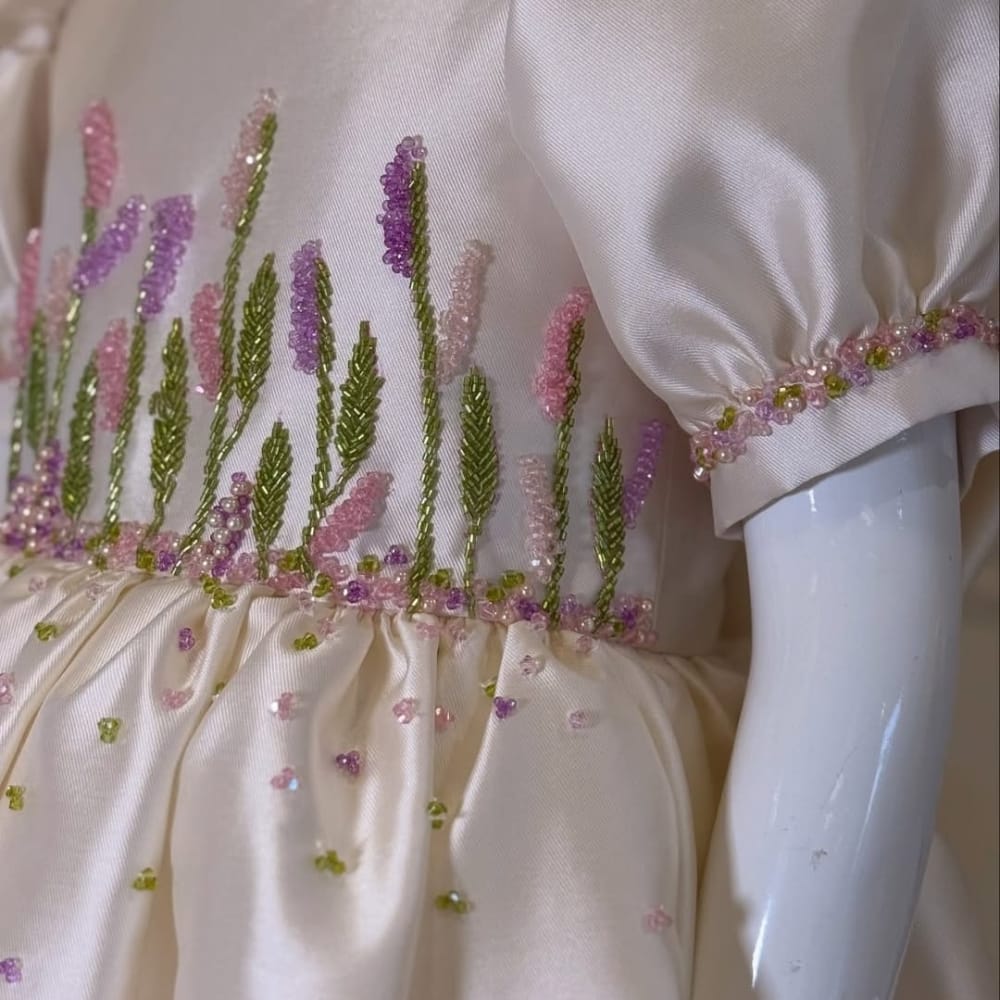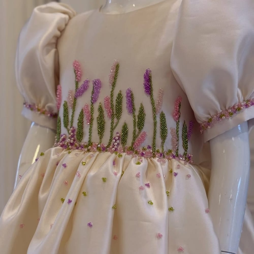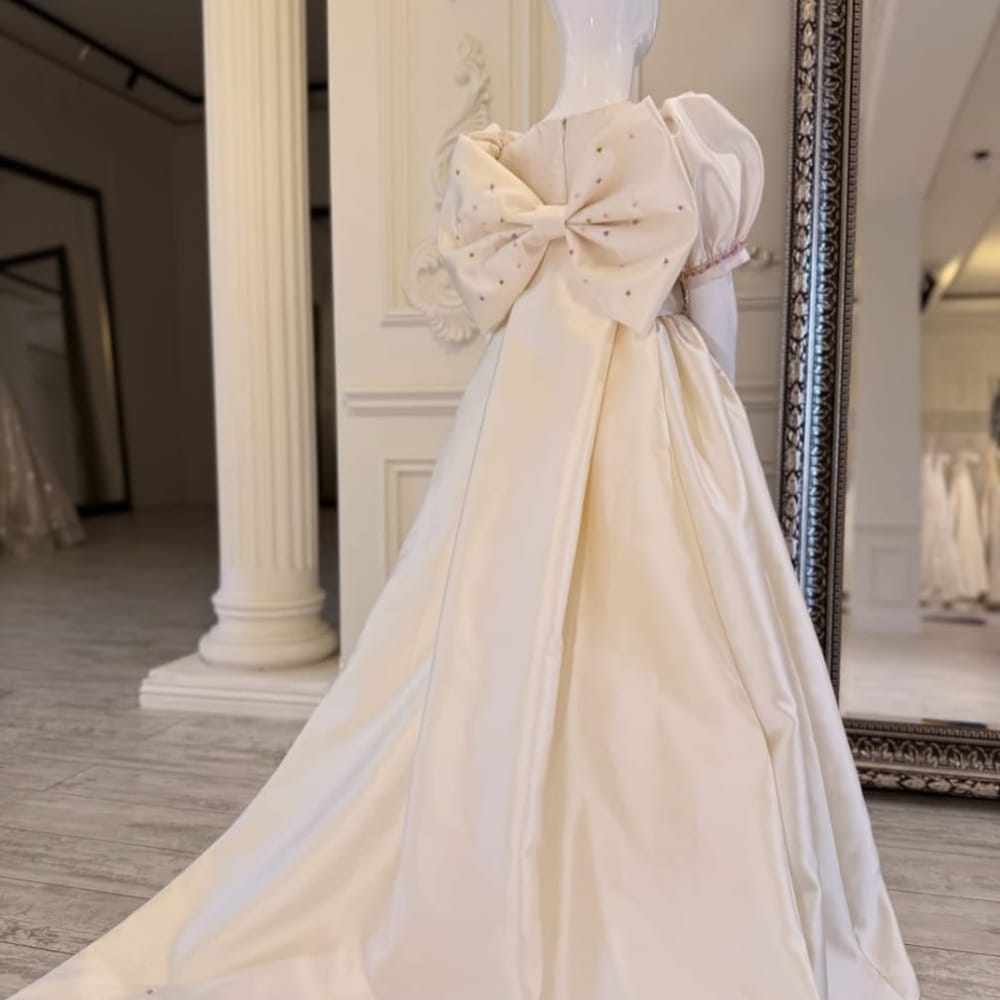 The gown is designed with a flattering A-line silhouette, a gently flared hem, and a soft inner lining for all-day comfort. A hidden back zipper ensures a secure fit, while charming details such as a satin sash, cap sleeves or illusion neckline (optional styles), and subtle sparkle accents add to its fairytale charm.
