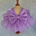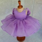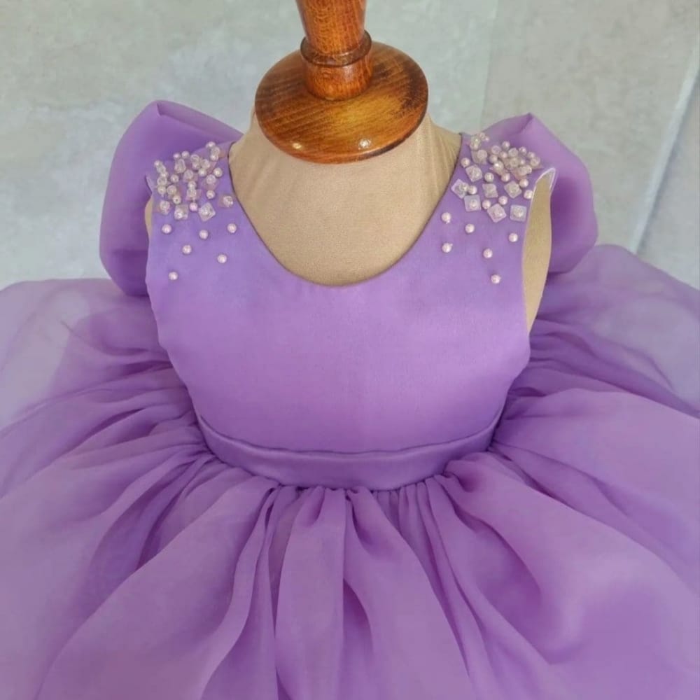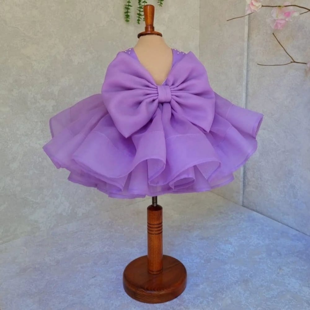Tiered Organza Skirt: Designed with multiple voluminous tiers of soft lilac organza, creating a full “cupcake” style skirt that is perfect for twirling.