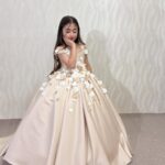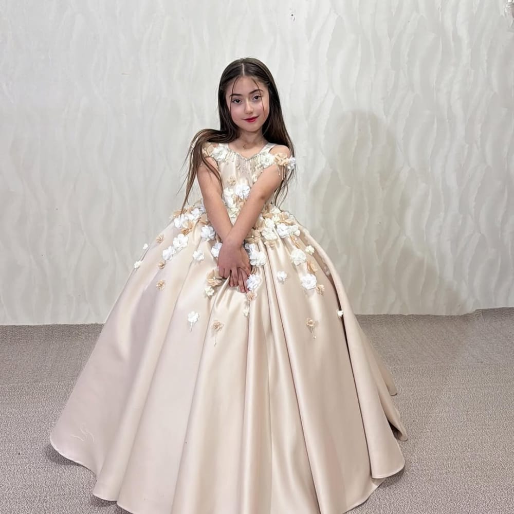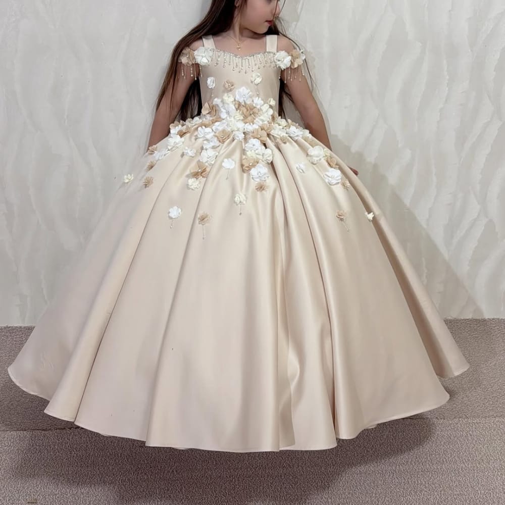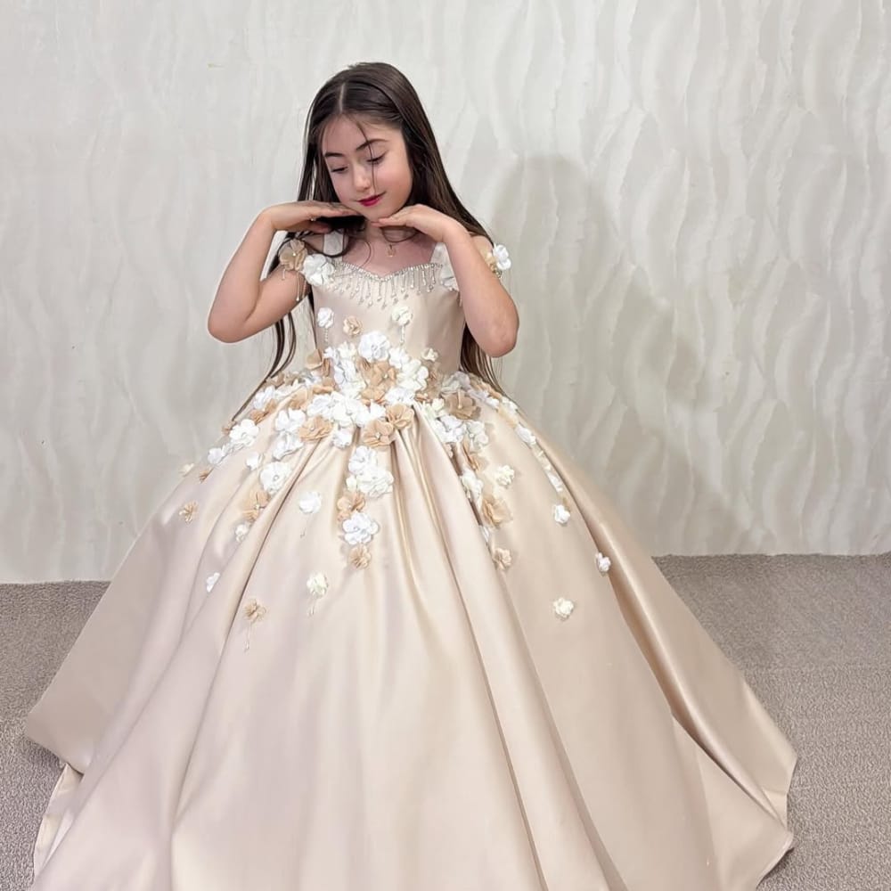 Step into a world of pure enchantment with our Primrose Champagne Couture Gown. Radiating sophistication and grace, this floor-length masterpiece is designed for the most prestigious occasions, combining a classic ballgown silhouette with breathtaking modern embellishments. Design Highlights Cascading 3D Florals: The gown features a stunning display of hand-applied 3D blossoms in ivory and champagne tones, flowing seamlessly from the bodice down the skirt.Lustrous Champagne Satin: Crafted from premium, heavy-weight matte satin, the dress offers a majestic sheen and a structured, voluminous drape that holds its shape beautifully. Delicate Cold-Shoulder Detail: The elegant neckline is accented with dainty floral straps and shimmering crystal fringe that catches the light with every movement.Grand Ballgown Silhouette: A full, sweeping skirt creates a dramatic presence, making it the perfect choice for high-profile events and photography.Perfect ForGrand Weddings (Flower Girl)Religious CeremoniesCouture PhotoshootsLuxury Birthday CelebrationsProduct SpecificationsFeatureDetailsColorRich Champagne / Antique GoldMaterialPremium Satin, Organza Florals, Crystal AccentsLengthFull Floor-LengthInteriorFully lined with soft, breathable fabric for ultimate comfortCareProfessional Dry Clean Only